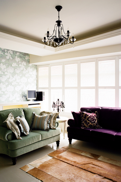 走進這個家,剎那間會以為自己來到美國紐約某知名藝文人士宅邸,女主人特別從美國購進古典樣式壁紙,透過線條簡潔卻也優雅的壁爐結合電視牆,與垂吊在天花板的水晶吊燈,搭配銀綠色及紫藍色美式沙發,並搭配客廳區域那塊乳牛皮地毯,眼前這幕居家場景,充分運用古典與現代元素混搭,讓人彷彿走進好萊塢電影裡的居家場景般。