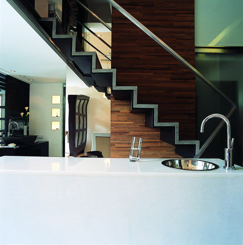 清亮的大理石吧台,在桃高格局的襯托下,是賓客聚餐響宴的美食平台。蜿蜒而上的階梯上利用垂直而下的不鏽鋼反射出寬廣的視覺效果,平行、垂直交錯間,運用材質變化出別緻的設計。