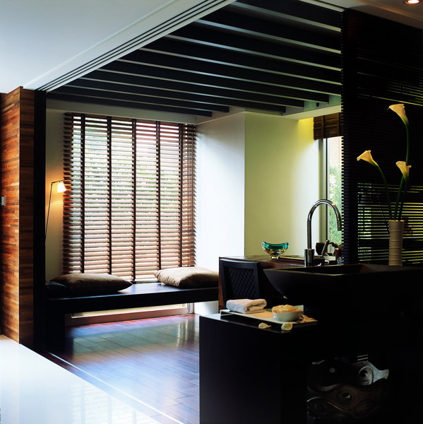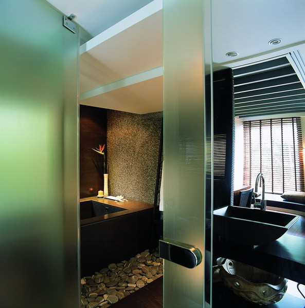 捨棄磚牆的隔間方式,藉由大片拉門,創造出獨立的空間。木頭百葉篩落出迷人的光影,和天花板上的鋼條交織出理性的和諧。 浴室的石子壁面有著東方特殊風味,木頭材質的溫潤又適切地中和了不鏽鋼與玻璃的科技感。