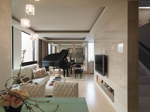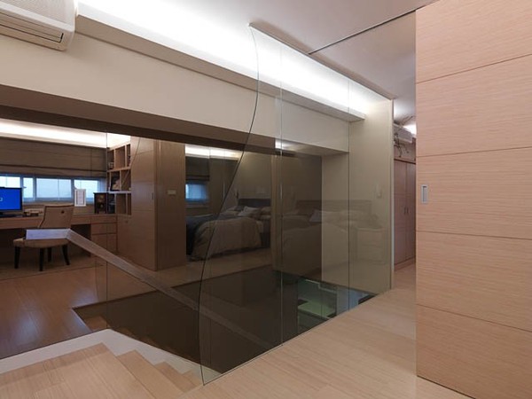 原10坪空間的套房,所使用的空間有限因挑高做了夾層,利用鏡子延伸空間。客戶是一位音樂家有台史坦威利演奏式鋼琴要放置及要求要有一間二人用書房、二間浴室。在設計之後這麻雀雖小的房子却五臟俱全