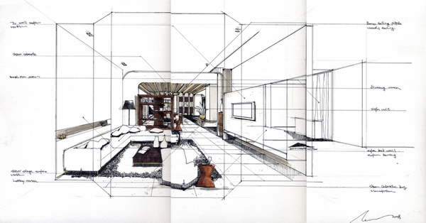 我喜歡在與屋主溝通時,隨手用筆畫出空間規劃的想法,有了具體的線條與圖像,屋主可以清楚知道我的想法,也比較容易表達他的需求與喜好。我喜愛手繪設計圖多於使用電腦繪圖,因為它多了一點「人味」與「自然」,手繪較電腦繪圖來的自然,獨特而無法複製,就像每個房子都該跟主人一樣,都是獨一無二。