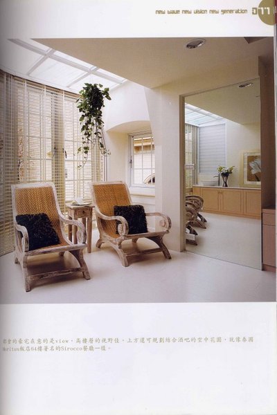 融入自然的表現除了靠自然的光線、綠意表現外,吳啟民還觀察到,以意象形式來表現概念的規劃,會開始由大建築物往室內空間蔓延。以北京的體育館「水立方」和「鳥巢」為例,單單用水和巢概念,居然能創造出不同於往的建築形體。「這些概念不單只有表現在建築體,居家空間會先以軟件的樣貌開始流行。」或許是以水的意象為設計主軸的椅子,慢慢進到居家空間,帶給人們一些生活上的視覺驚喜。