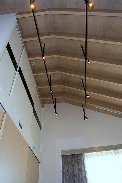眼光向前方挑望就可看到兩層樓高的儲衣櫃,要上到頂端,還得藉助特製的雲梯才上的去。儲衣櫃的前方,是經過特別設計的燈具,用心改裝的風格燈具,是挑高臥室獨享的專利,一般的臥室,無緣使用這樣特別的燈具。