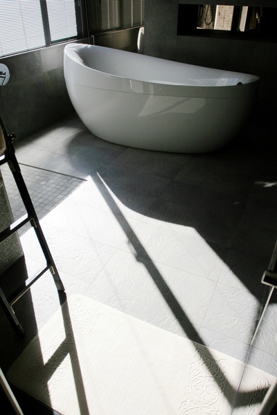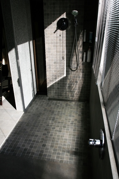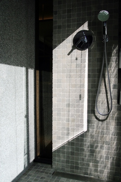 浴室地板的斜坡設計,運用輾石子與磁磚不同的材質,有區隔協調的趣味,又能讓水流流動順暢,利於排水,兼具設計的美感與實用的功能。