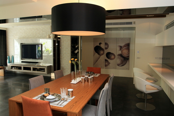 劉先生信任尚展的設計,所有的家具、家飾的選購、搭配全委由尚展處理,客廳的斜角展示櫃、餐廳的餐桌、餐椅;書房的造型書桌,都由尚展設計特別訂做或選購;每一個餐盤、刀插、茶具、花器,木偶擺飾,都由專業人士做整體搭配。