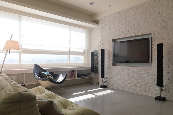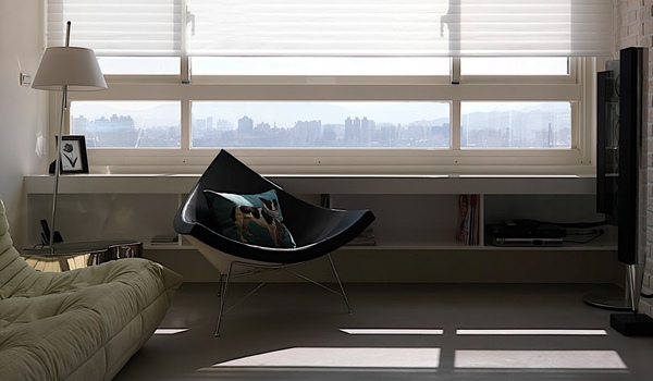 在窗邊擺設的是 Herman Miller 設計總監George Nelson的經典代表作:Coconut Chair,這隻名為椰子(Coconut)的單椅,從正面看是扇形,俯視則為三角形,從不同的角度欣賞,都各具造型的趣味,不僅設計感十足,而且坐起來也十分的舒適。我們特別把他安置在有山景的窗邊,設計了鋼烤的白色長條窗台,讓屋內的視野穿透出去,讓這空間充滿時尚的魅力。Coconut Chair、白色窗台、城市的大樓,堆疊的山景,再加上陽光照射室內的光影,就如同畫境般的,讓人升起能在此生活,其他無所求的幸福感。