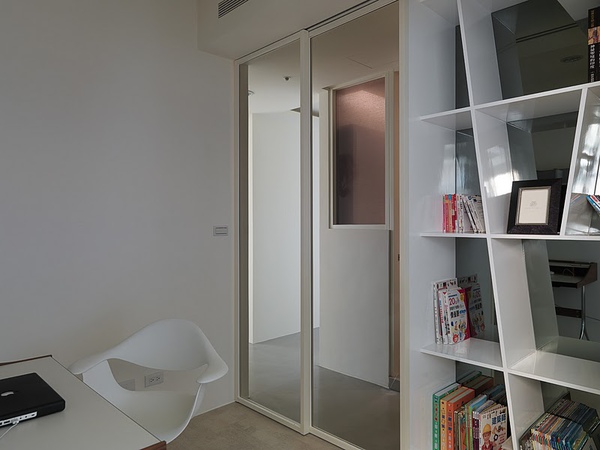 這個書房最美的是,還可看到左方穿透的寬闊空間,這兒原本是道隔間牆,牆外是後陽台,當把隔間牆移開,換成大片的格子推門,把後陽台的地面與牆面鋪上地板後,把陽台空間做了最大附加價值的應用,變成了家中最佳的休憩空間。