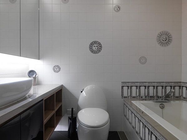 衛浴空間也經過多所琢磨的設計,採用義大利插畫名家繪製圖案的磁磚,讓這個衛浴看來賞心悅目,洋溢著清新怡然的設計感。衛浴的空間就算不是很寬敞,但身處其間,卻會覺得很放鬆、愉悅。設計就該是為了感官的愉悅與良好的使用機能用心,這樣才能凸顯設計的價值。