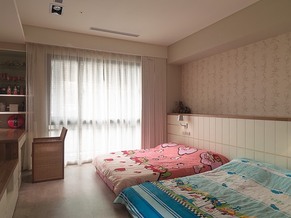 陳家的寶貝還小,需要父母的陪伴,陳宅的主臥房擺設了兩張床墊,讓孩子可以跟爸爸媽媽一起睡覺,等到孩子長大可以在自己的房間睡覺時,床墊就可撤掉,只擺一張雙人床,當然床邊櫃的位置,電源插座管線,都已經預留妥當。