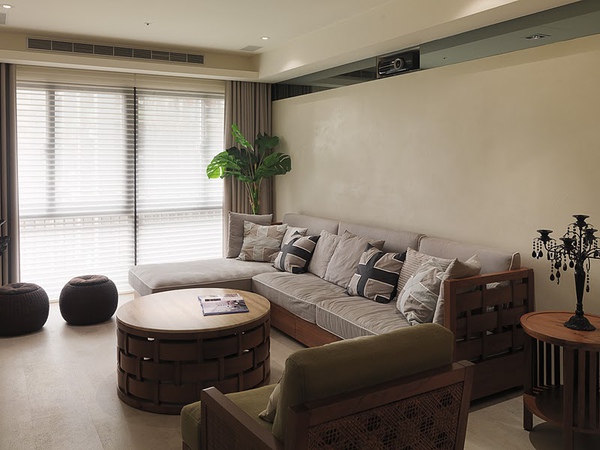 陳宅客廳寬大的主牆沒有架設電視,卻留有電視及電源的管線插座,「小孩還小,不需在客廳擺電視,」陳太太說,等過幾年孩子長大了,才會考慮放電視。預設管線是為未來的設想。目前陳家的客廳只擺設了投影設備,客廳是用來陪伴孩子的場所,並不用來看電視。