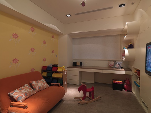未來的女兒房,現在是兩個孩子的遊戲間,色調、裝飾都為了女兒設想好。現在這兒也擺設了個沙發床,若有親友來訪,這裡也可變成客房。