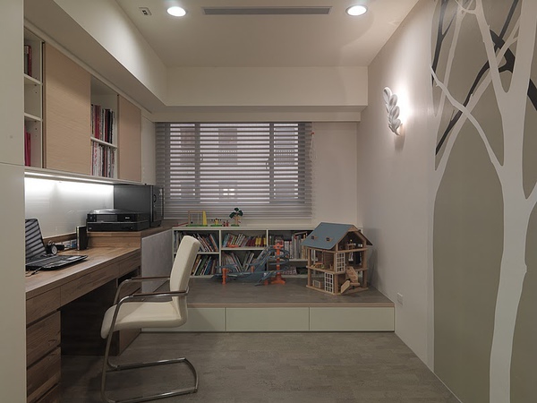 這裡是未來小男孩的房間,現在是爸爸的書房,窗邊架高的空間,下方是儲藏櫃,等小孩長大,上方鋪上床墊就是臥床。男孩房的門,採用玻璃拉門,現在是為了讓媽媽可以在客廳,隨時看到孩子的動態,隨時照應,將來可以拉上玻璃拉門的窗簾,孩子也可保持個人的隱密性。