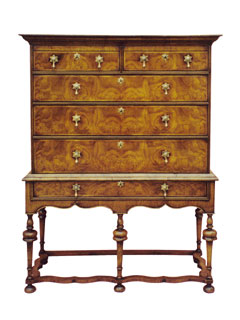 威廉瑪麗時代的設計,可以以這個高腳抽屜櫃為代表。特徵是倒轉杯狀的櫃腳造型。硬底子的冷冽線條,襯托著該世代不妥協的特性,到了進步繁華的現代,那種頑固,反而成為一種時尚的酷。