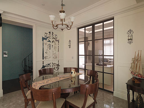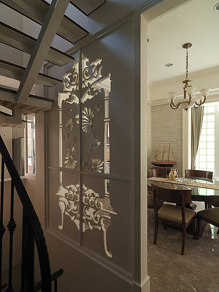 這個「愛與分享」的屏風,被安排在餐廳與樓梯間之間。餐廳是美式生活的重要空間,不僅家人經常在這裡享用食物,客人來訪時在此用餐,或是聊天、喝下午茶,分享生活的種種經驗與感受,是「愛與分享」的最佳場域。當客人坐在餐廳,看著這個屏風,自然就會問到這個特別的設計,「愛與分享」的話題自然展開。