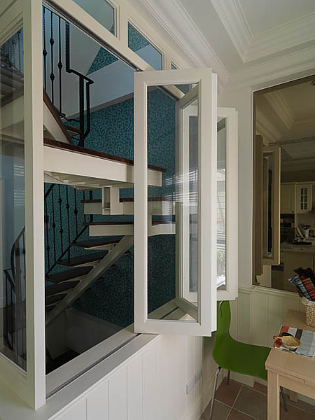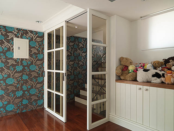 任宅是個五層樓的別墅,我們在樓層的設計上,讓他有不同的機能,有共通的風格,卻有不同的面貌。一樓白色推拉式的窗台設計,這樣的窗台在一般的住家裡是較為少見的,這讓任家的空間視覺多了生動的表情。沿著窗台的樓梯往上走,每個樓梯間花式各異的壁紙牆面,就預告了每個樓層各具特色的設計。