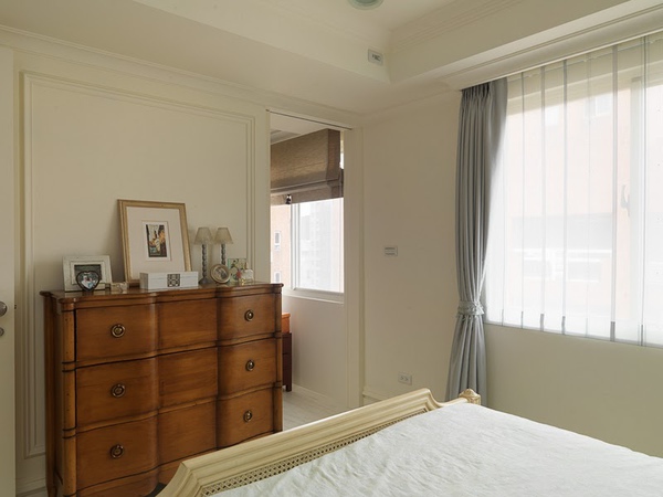 另外這間臥房,走的是法式鄉村風格,以編織花紋為主體的臥床有著異國情調,床邊櫃特地選了不同樣式的櫃子做混搭。