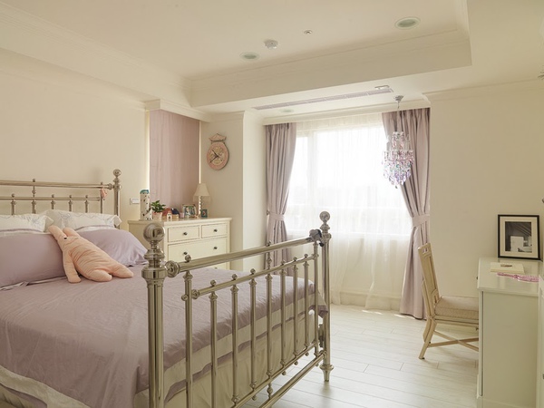 走進這間以薰衣草色調為主的臥房,心情應該很快就會轉為晴朗,這個房間沒有多餘的設計,說來簡單,就是主床、床邊櫃、窗簾、水晶燈的組合。奇妙的是,這些元素聚集在一起,就是那麼的優雅宜人,像是素顏的美女,百看不膩。在這樣的房間裡入眠,連作夢也是香甜的。