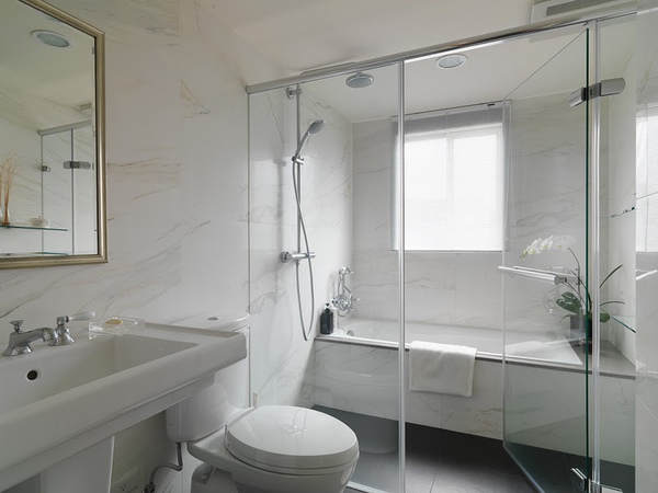 看看這間浴室,整片的大理石牆面、雙人洗手抬、金屬銀邊的鏡台,一樣的簡潔樸質,明亮沈靜,這該是洗滌身心疲勞的最佳場域吧!