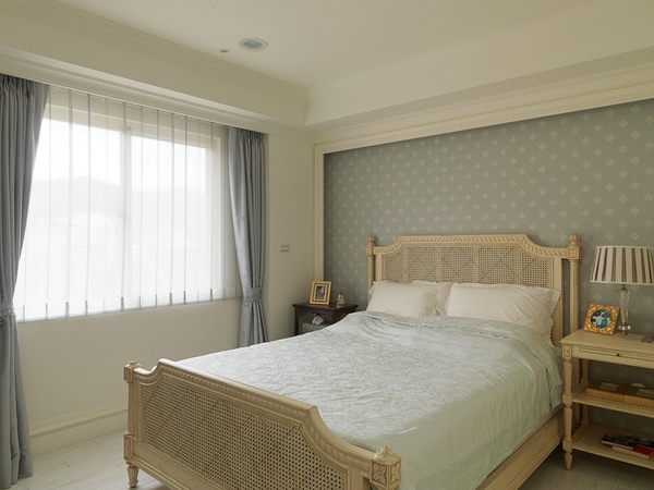 藍綠色調的壁紙定位了整個房間的主調,窗簾做了對等的呼應,一樣是營造可以讓人放鬆休息的氣氛,充分發揮臥室應有的功能。