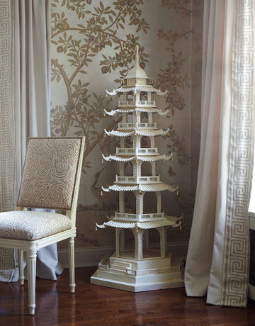 花鳥圖案,中式織品及壁紙,是最容易表現出中國山水氣味的陳設方式,塔寺造型,窗櫺圖案,同時散發出更濃郁的中國情調。