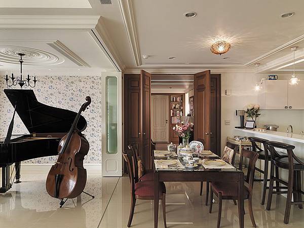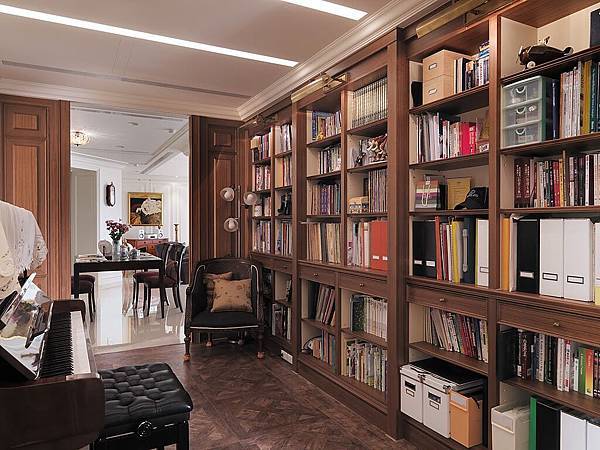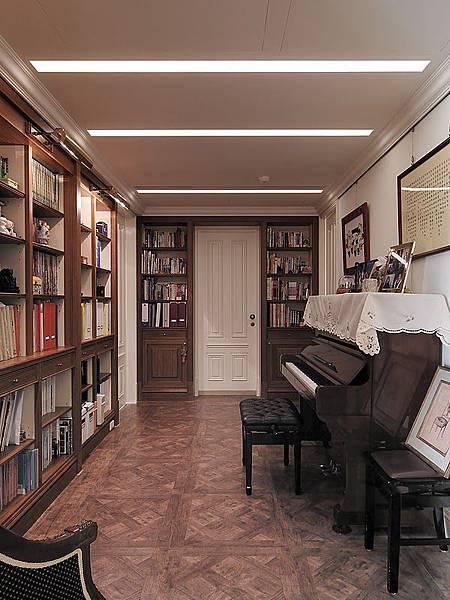 我們特別把走道的空間加大,就像把心房擴大打開,原木色的地板、整面的書牆,穩重的色調,為主人深厚的人文素養墊基,滿牆的書籍,書架旁的鋼琴,則顯露了主人的涵養與音樂的造詣。