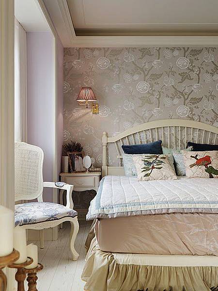 主臥室的色調,採用的是Nick老婆偏愛的粉紫色系。進入主臥的門口有點小玄關的味道,在天花板設計了個圓形間接照明,Nick跟老婆都很喜歡,笑說兩人像是超人,可以在這裡變裝,出了門就是無敵超人。