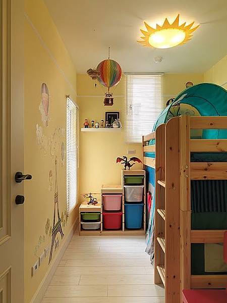 Nick的小孩房空間更狹小,為了充分利用空間,用了上下層的床組。色調是溫暖的黃色。天花板的太陽造型壁燈,牆壁的巴黎鐵塔、氣球壁紙,加上小層架、飄浮的氣球裝飾,這小小的空間,也是十分迷人。