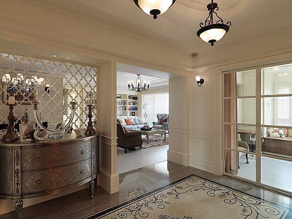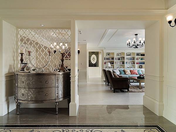 一進陳家住宅玄關,就可見到Lillian August的邊櫃,玄關的雕花屏風,用的是穆斯林的圖騰花式,具有異國風的華麗優雅。玄關的拼花磁磚、牆壁的花飾壁紙,與Lillian August玫瑰花飾和諧連成一氣,凸顯了強烈的女性優雅氛圍。