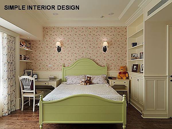 鮮綠色床點出特色。兩旁以小茶几配書桌帶出實際使用需求。