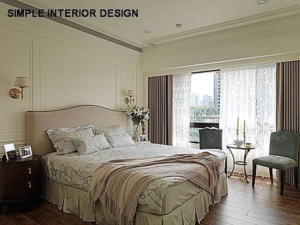 米色英式風格的床板配深色櫃子,白色主牆規劃2盞壁燈,潔淨高雅。