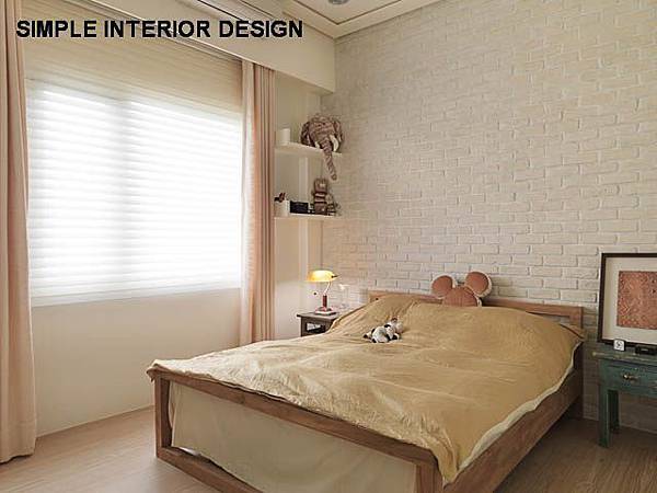 白色文化石牆面搭配簡單木頭框床架,焦點是兩只不同的老櫃,分別放上畫作與桌燈,輕鄉村好舒服!