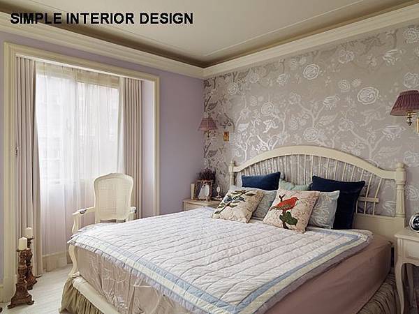 壁紙花紋呼應圓弧柵欄床的線條,為臥房注入浪漫元素。