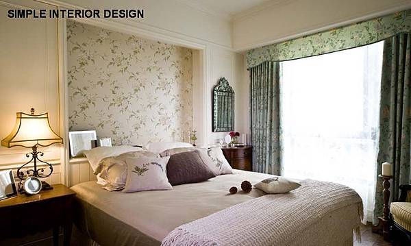 右邊為收納櫃搭威尼斯鏡(當化妝台使用,國外很多人常拿收納櫃當化妝台使用)、左邊為一般床頭櫃,碎花壁紙、窗簾平衡整體空間。