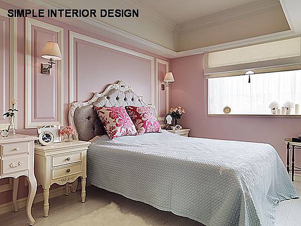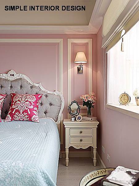 法式雕花古典造型床板搭白色床頭櫃,灰藍色床板和粉色牆面帶出優雅感,簡化法式華麗元素,