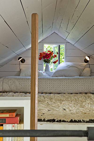 閣樓鋪上長毛白地毯、床墊和白色抱枕,就成了秘密基地,可倚著窗閱讀、休憩。