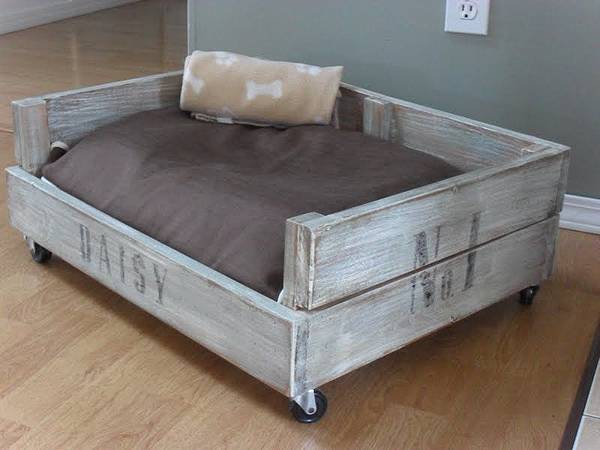 到處移動的鄉村木床。木箱刷白,裝上輪子,還可印上寵物名~