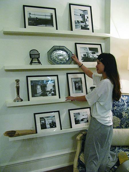 牆上有4層板,每個深12公分、高4公分,層板前方還有檔板,可固定物品免於滑落,黑色框裡是尚展的空間作品,特地以黑白照的方式呈現,上頭的框統一為黑框,如此怎麼擺都不會顯得雜亂,還能加入瓷盤、迷你椅、燭台、乾燥花束來增加變化。層板牆最大的優點是畫作、相框不用釘在牆上,你可以左移、右移、上上下下隨性移動,感受組合的樂趣,移動的過程還能增進佈置的功力。