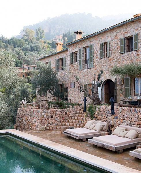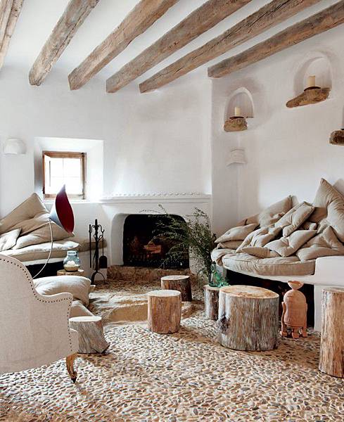 設計師Alexandre de Betak在法國地中海旁的小村落,打造了有機住宅,保留天然的石頭樣貌、搭配古樸的木質橫梁,玄關上方切開的天花,露出橫樑,可看到內部的線條都是圓滑曲線,少有90度直角。