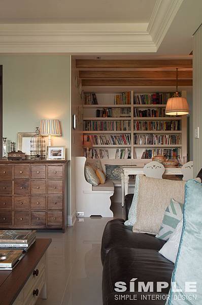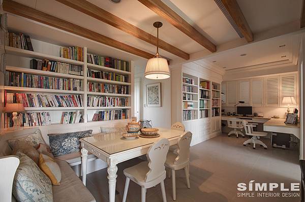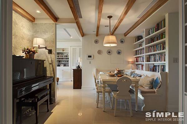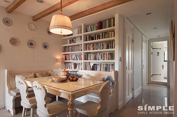 量身打造的白色木頭長椅,厚實的底座配上曲線椅腳、椅背,沈穩而不沈重,上頭擺放軟坐墊與抱枕,比起普通餐椅更讓人想窩在裡頭,訂製的座椅後方是一面落地書櫃,正好用來擺放屋主的藏書,天花板的木頭橫樑裝飾帶出木屋生活的意象,牆上掛著屋主蒐藏的瓷盤,一家人除了可在此用餐外,還能當作閱讀、品茗角落,將餐廳的功能發揮到無限大。