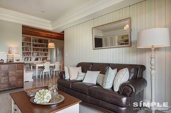 歐美住家擅長用家具來營造風格,這裡也有不少精彩示範,門口處的深色木頭櫃是屋主舊家所帶來,和餐廳的木頭橫樑、客廳的皮沙發相呼應,形成流動串連的空間感,沙發後方的主牆掛上大面鏡取代畫作,來延伸客廳的空間感,鏡面反射主燈和壁櫃,空間居然有放大2倍的錯覺。