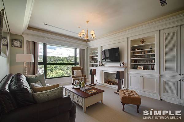 扣掉公設後屋內坪數約40多坪,風格營造之餘,收納需求仍不容忽視,客廳壁爐兩旁、分別規劃百葉鞋櫃與展示櫃,造型壁爐裡還擺上原木,營造情境,餐廳櫃子後方規劃了小型儲藏室,得以安頓家中瑣碎雜物。