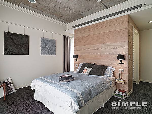 更衣走道的隔間剛好成了床鋪主牆,簡單層板取代床頭櫃,搭配兩盞壁燈,詮釋簡約之美。