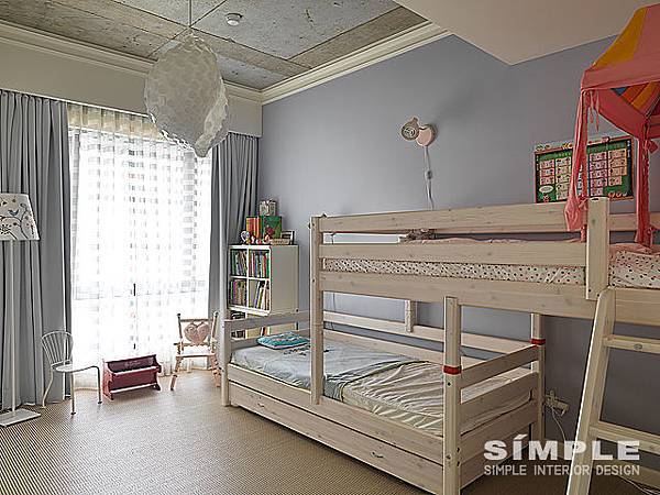 兒童房走灰藍色調,特地選用無毒地板保護孩童健康,為保有空間靈活度,搭配可移動上下床鋪、收納櫃、立燈,由於光線充足,整個空間散發低調卻不失時尚的風采,一如柯小姐予人的感覺,