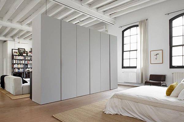 用衣櫃做隔間,左右形成流暢動線,櫃體正對床鋪擺放保有適當隱私。