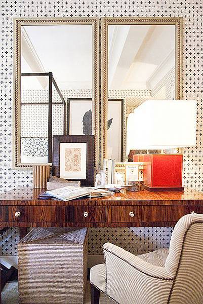 設計師thomas o'brien對空間配置可說是其中佼佼者,可以看出大多數線條都是俐落的,不管是窗戶或家具,細看家具材質會發現,古典的金箔、沙發釘釦、金邊把手運用其中,古典元素也常被運用在家飾搭配上,例如:選用金邊的畫框、東方的陶馬、古董箱來帶出歷史陳舊感,屬於新的現代線條和舊的元素撞擊出似曾相似的歸屬感,像是在現代優雅氛圍裡輕輕地吹過一陣復古風,帶來回味無窮的細緻韻味。