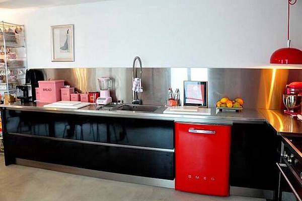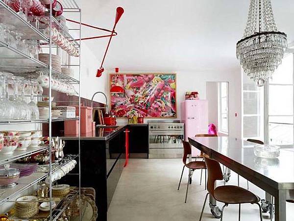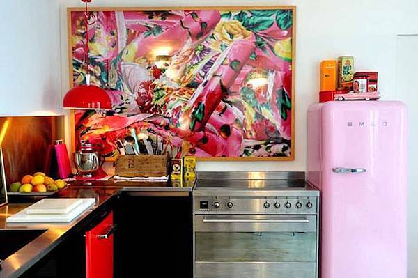 廚房用色搭配更是絕妙,黑色鋼琴烤漆櫥櫃配上粉紅色冰箱,呼應烤爐上頭粉色系為主的抽象畫。