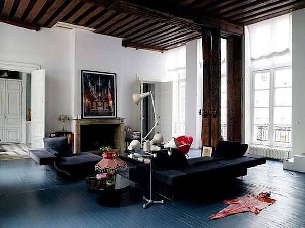 法國老屋原木天花橫樑,注入質樸感,底下陳列現代黑色沙發,畫龍點睛搭配粉色古典燈罩桌燈與單椅、小地墊。