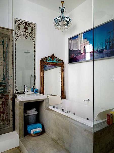 樸實無華的水泥衛浴,搭配古典銅雕鏡、水晶燈與一扇非常老舊的木門,衛浴間馬上有了獨特個性。
