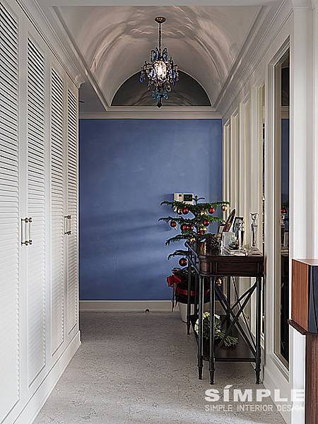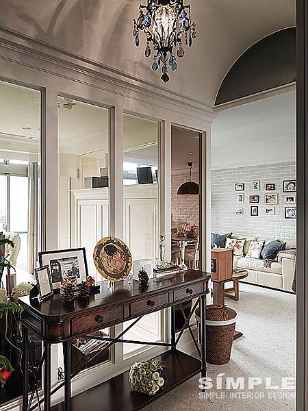 這樣的平面配置規劃也獲得屋主的好評,一進門拱形的天花廊道有著古典氣勢,配上水晶吊燈,帶出些許歐洲風味,書房和玄關間特地選用玻璃門片當隔間,電視牆上方也特地用玻璃來增加光線流通,如此,讓玄關變得明亮開闊,玄關、客廳與書房間機能各有所屬,卻又能同享戶外光線,採光與機能同時兼顧。