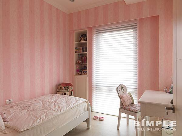 青春少女的房間,條紋壁紙帶出較中性的線條,也有拉長空間的效果,粉紅色,則繼續保有女孩的單純甜美。